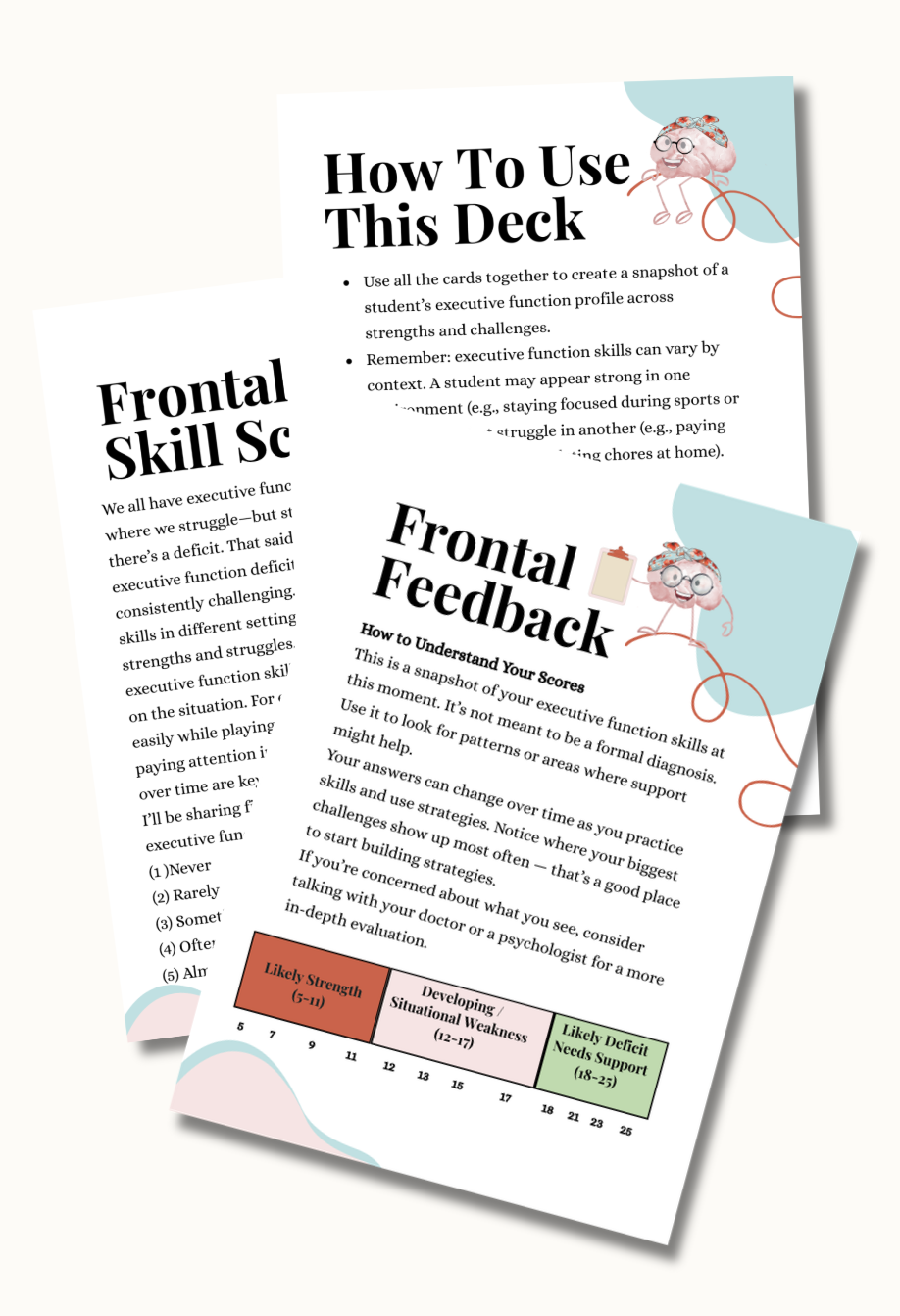 ✅ 16 cards focused on helping educators assess their students’ E.F. strengths and challenges