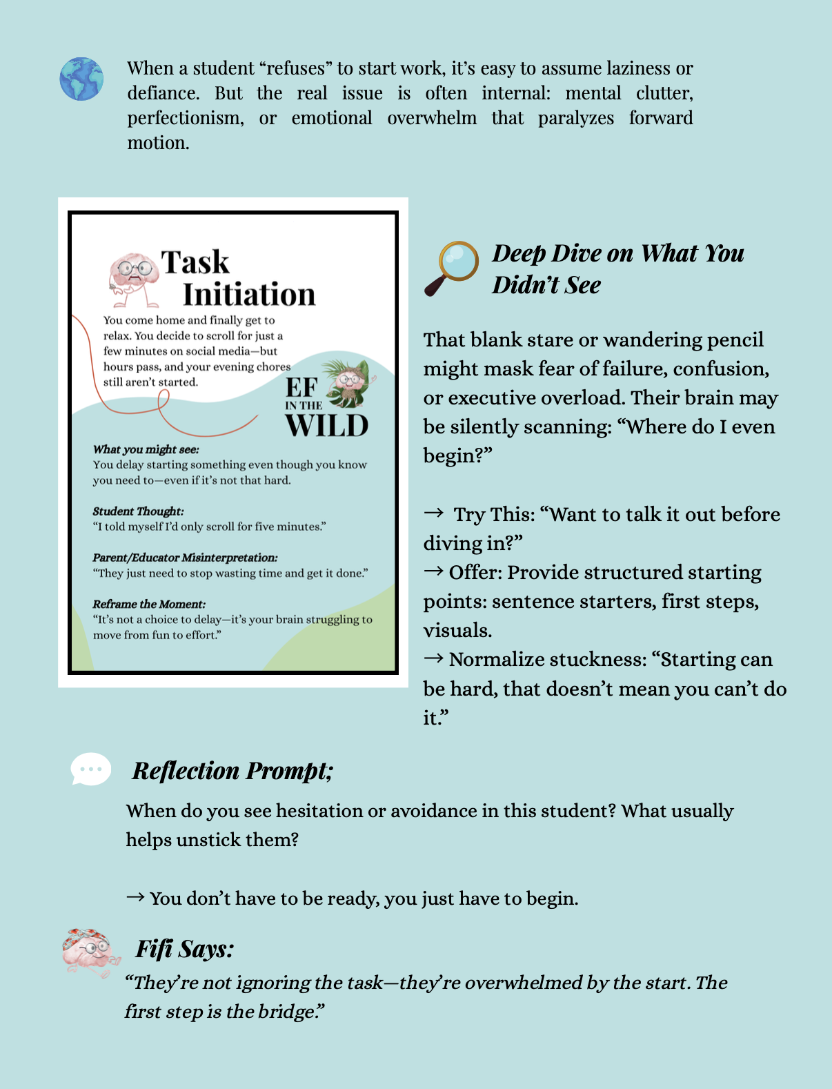 These cards are designed to help educators recognize how executive function challenges show up in real, everyday contexts.